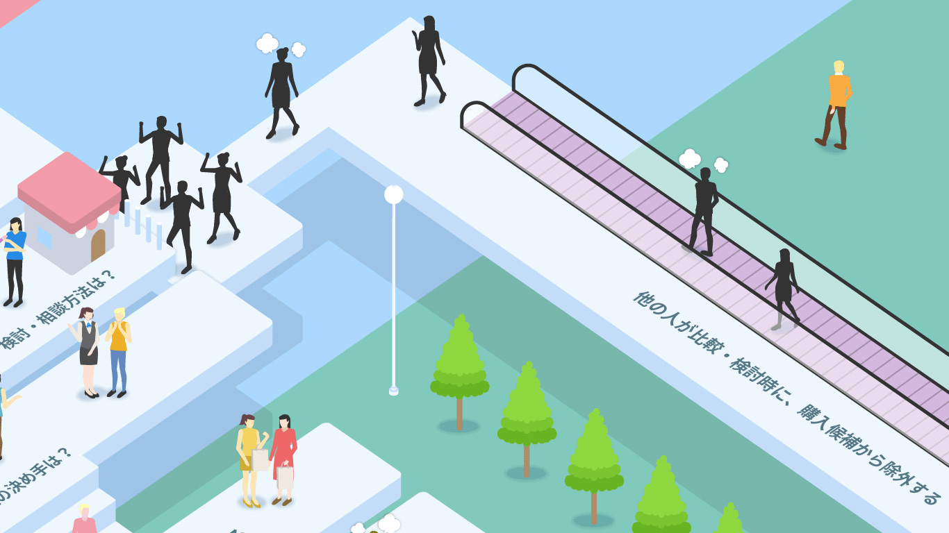 消費者は企業とのコミュニケーションを通じて、特定の商品・サービスを認知し、比較検討を経たうえで購入を決めます。