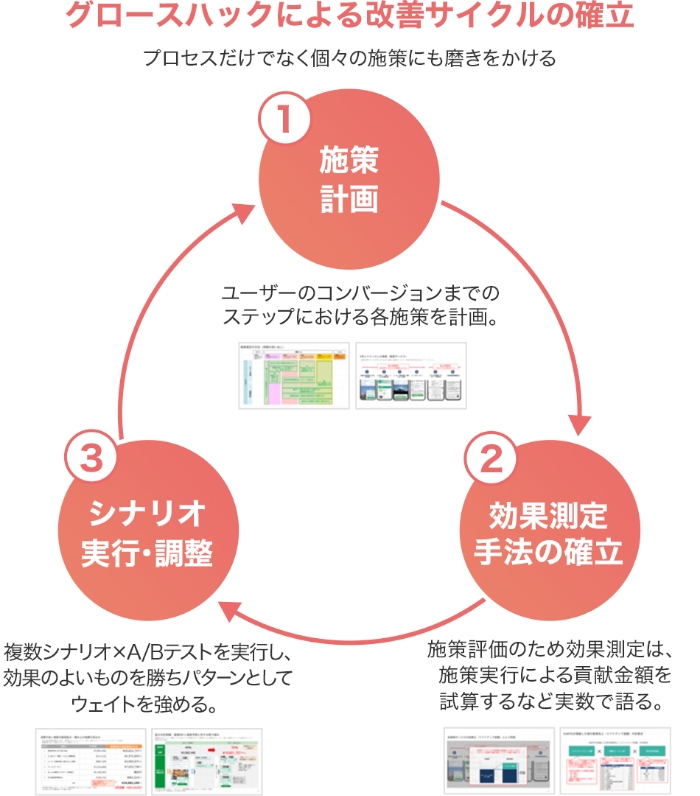 グロースハック推進は、従来のマーケティング手法とは違いデータを重要視しており、経験や勘だけに頼らず効果的な施策立案ができます。そして、一部の部署だけでなく組織全体でデータ活用ができるため、予算を抑えたうえで、大規模な施策を打ち出せます。トランスコスモスでは、このようなグロースハックによる改善サイクルを確立し、Webサイト改善やデジタル統合運用など多数のプロジェクトにて成果を上げています。ぜひお客様のお悩みをご相談ください。