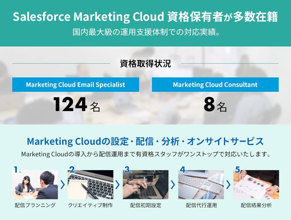トランスコスモスの1to1マーケティングは、マルチプラットフォームでの施策運用を支援いたします。「Salesforce Marketing Cloud」でユーザー情報や購買情報、アクティビティ情報を管理し、メール、LINE、SMS、Webサイトなど多様なチャネルを使用し、一人ひとりのユーザーにあったサービス提供をMA化して運用できます。